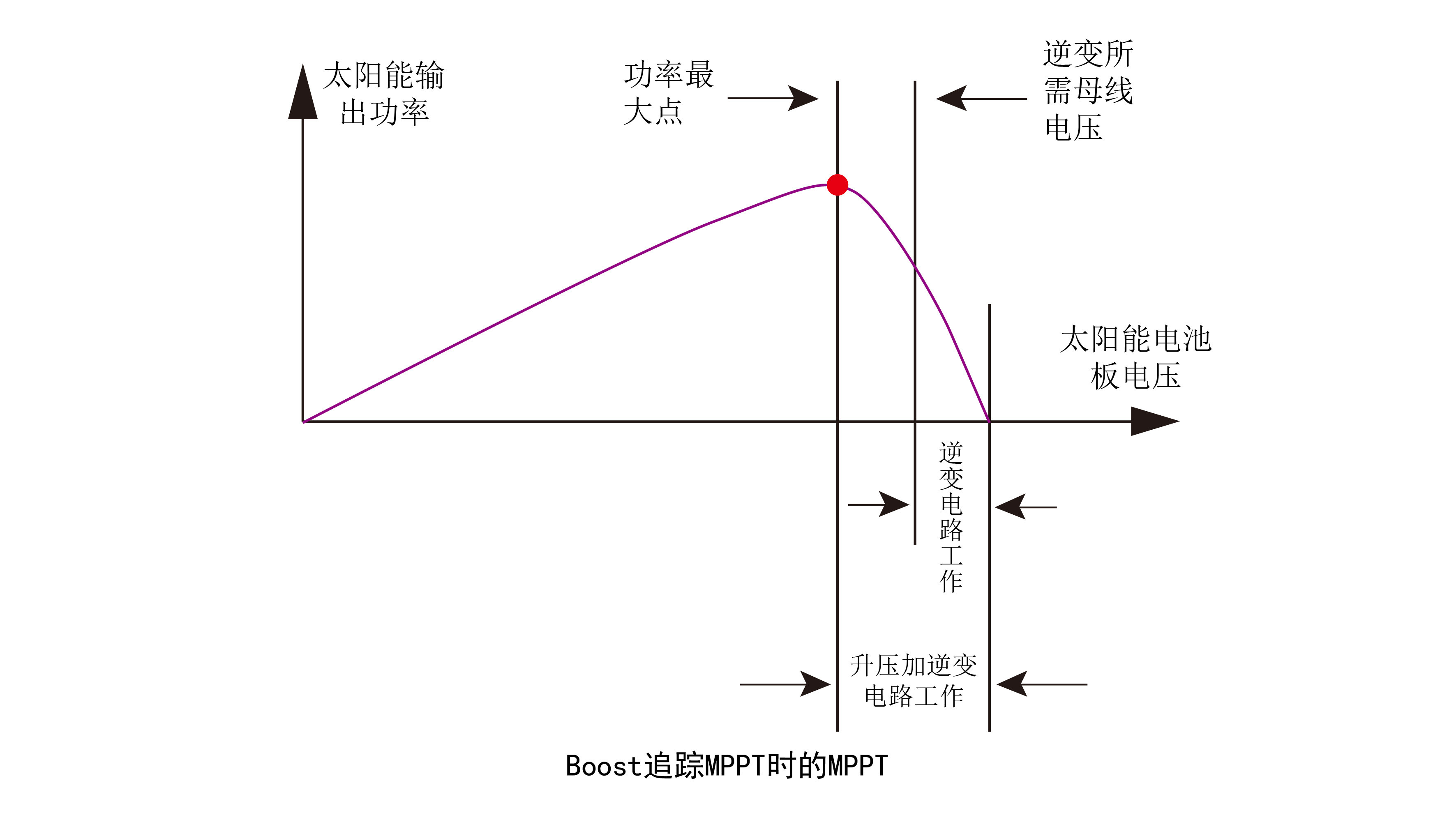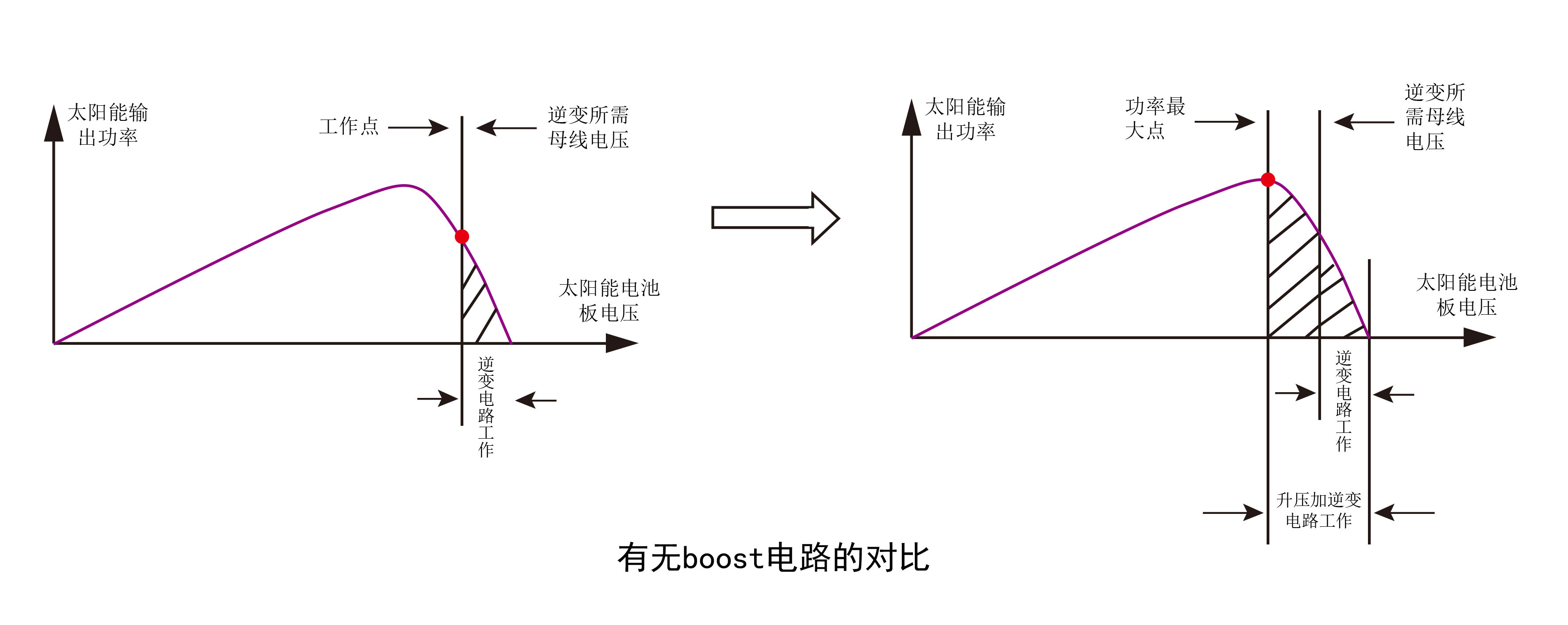 對(duì)于一個(gè)太陽(yáng)能并網(wǎng)系統(tǒng),時(shí)間和天氣都會(huì)導(dǎo)致陽(yáng)光輻射的變化,其功率點(diǎn)的電壓就會(huì)不斷變化,為了提升發(fā)電量,保證在陽(yáng)光弱和強(qiáng)時(shí)都能讓太陽(yáng)能電池板都輸送出最高的功率,通常逆變器中都會(huì)加入boost升壓系統(tǒng)來(lái)拓寬其工作點(diǎn)的電壓。