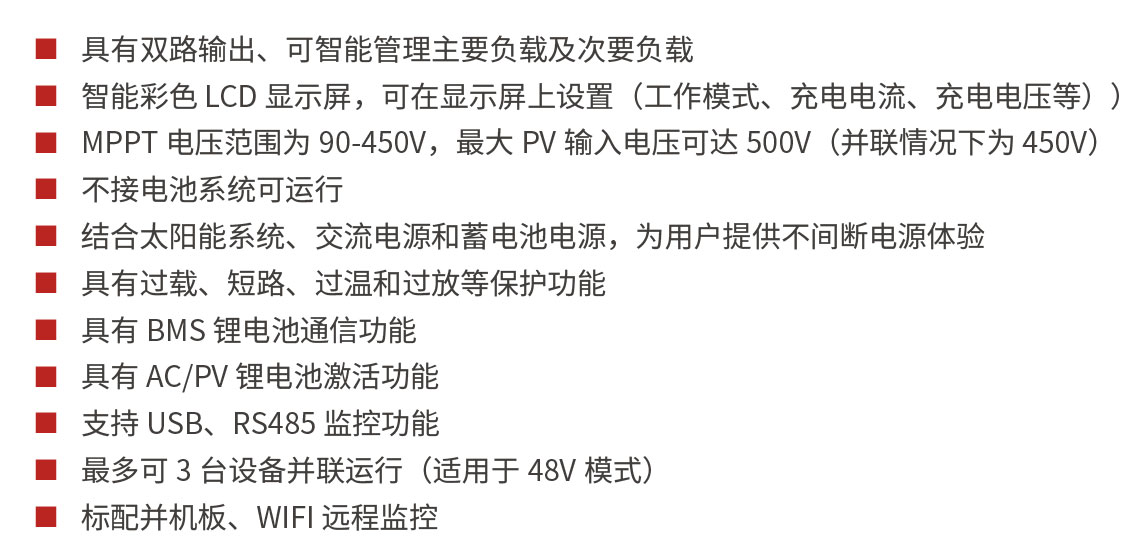 PH1900 EXP 是一款多功能逆變器 / 充電器,結(jié)合了逆變器、MPPT 太陽能充電器和電池充電器的功能,PH1900 EXP 系列無需電池即可運行。最大 PV 輸入電壓可達 500V,MPPT 電壓范圍為 90~450Vdc,內(nèi)置兩個 MPPT 太陽能充電控制器,可幫助客戶充分利用太陽能。