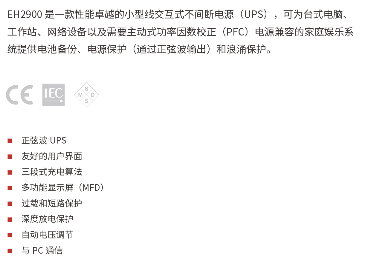 EH2900 是一款性能卓越的小型線交互式不間斷電源(UPS),可為臺式電腦、工作站、網(wǎng)絡設備以及需要主動式功率因數(shù)校正(PFC)電源兼容的家庭娛樂系統(tǒng)提供電池備份、電源保護(通過正弦波輸出)和浪涌保護。