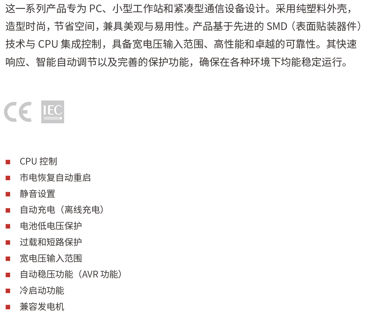 這一系列產(chǎn)品專為 PC、小型工作站和緊湊型通信設(shè)備設(shè)計。采用純塑料外殼,造型時尚,節(jié)省空間,兼具美觀與易用性。產(chǎn)品基于先進的 SMD(表面貼裝器件)技術(shù)與 CPU 集成控制,具備寬電壓輸入范圍、高性能和卓越的可靠性。其快速響應、智能自動調(diào)節(jié)以及完善的保護功能,確保在各種環(huán)境下均能穩(wěn)定運行。