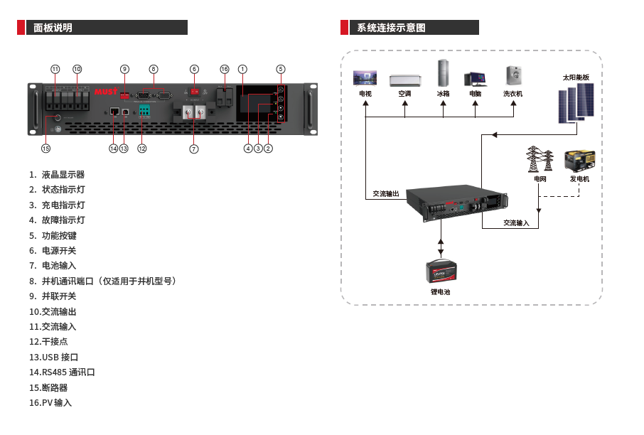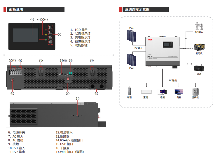 - 具有多模式設(shè)置功能,可通過 LCD 屏選擇設(shè)置光伏、市電、電池的優(yōu)先等級(jí)